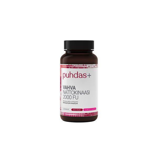 Puhdas+ Nattokinaasi sisältää perinteisestä japanilaisesta natto-ruoasta saatavaa tehokasta natto-entsyymiä. Tuote on vahva ja hyvin imeytyvä. Kapseli on pieni ja helposti nieltävä.