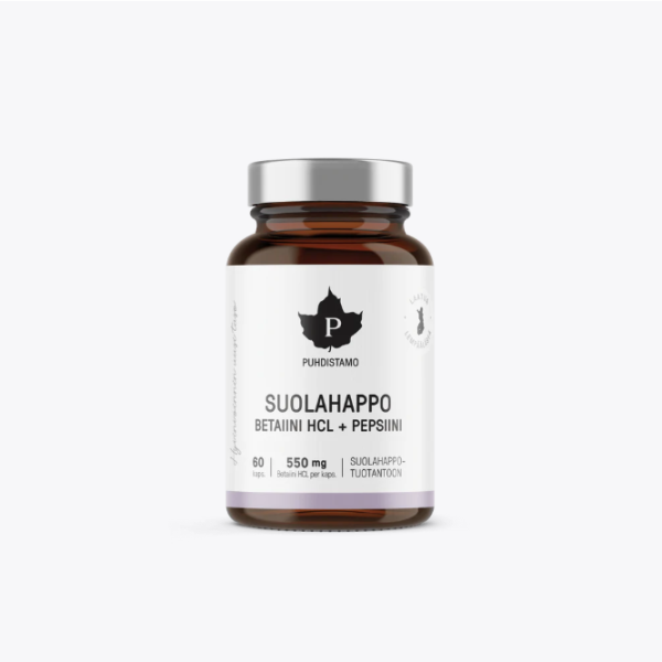 Puhdistamon Suolahappo on kehon omaa suolahappotuotantoa tehostava lisäravinne, joka muokkaa myös ravinteet paremmin imeytyvään muotoon. Tuotteen ainesosia ovat betaiiniin kiinnittynyt suolahappo, pepsiini ja keltakatkeroyrtin juuriuute. Maksimoi vaikutus käyttämällä tuotetta yhdessä Puhdistamon Ruoansulatusentsyymien kanssa