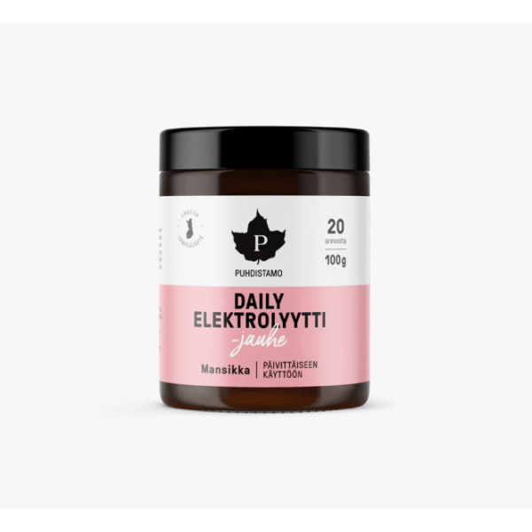 Puhdistamon Daily Elektrolyyttijauhe on raikas mansikan makuinen janonsammuttaja, joka auttaa ylläpitämään kehon optimaalista nestetasapainoa.