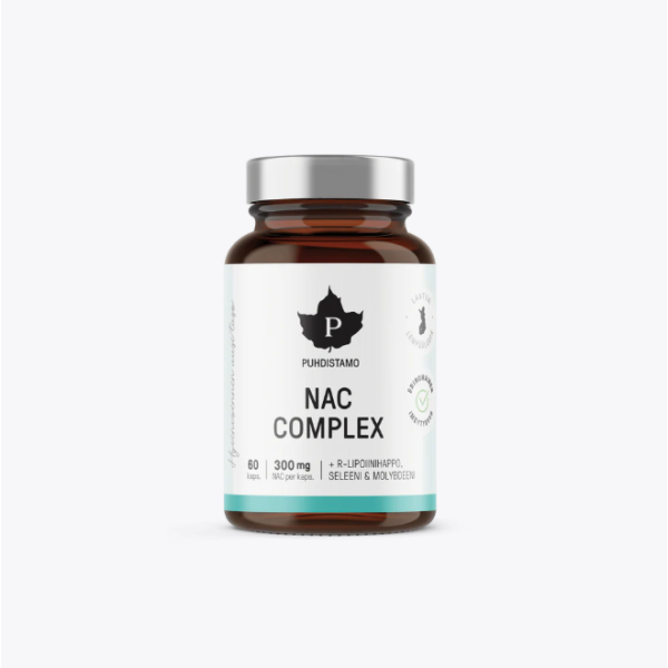 Puhdistamon NAC Complex on korkealaatuinen ja kokonaisvaltainen aminohappovalmiste, joka sisältää N-asetyyli-L-kysteiinin (eli tuttavallisemmin NAC:n) lisäksi muun muassa aktiivista R-lipoiinihappoa, seleeniä ja molybdeenia.