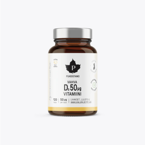 Puhdistamon Vahva D-vitamiini on vahva ja monipuolinen 50 µg D3-vitamiinivalmiste, joka on suunniteltu tukemaan kehosi D-vitamiinitarpeita ympäri vuoden. Valmisteessa yhdistyvät korkealaatuinen turskanmaksaöljy ja lanoliinista (lampaanvillan rasvasta) saatava D3-vitamiini eli kolekalsiferoli, jotka yhdessä tarjoavat luonnollisen ja tehokkaan ratkaisun D-vitamiinin saantiin.
