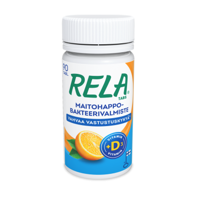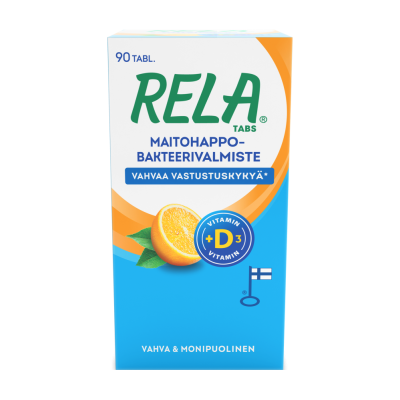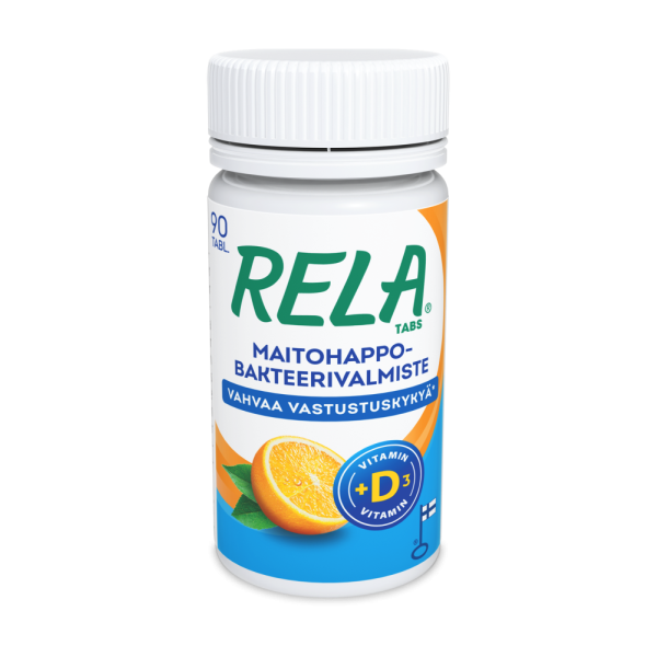Uudistuneet Rela-maitohappobakteerivalmisteet sisältävät kahta tutkittua ja korkealaatuista bakteerikantaa (Lactobacillus rhamnosus SP1 ja Bifidobacterium lactis BLC1) ja 3 miljardia bakteeria päiväannosta kohden. Vahvaa vastustuskykyä** – Rela Tabs Appelsiini + D3 sisältää maitohappobakteerien lisäksi D-vitamiinia, joka on tärkeä vastustuskyvyn ylläpitäjä. Rela Tabs Appelsiini + D3 maistuu pirskahtelevalle appelsiinille, ei sisällä sukraloosia ja sopii koko perheelle. Uudistuneet Rela-tuotteet on valmistettu Suomessa ja niillä on avainlippumerkki.