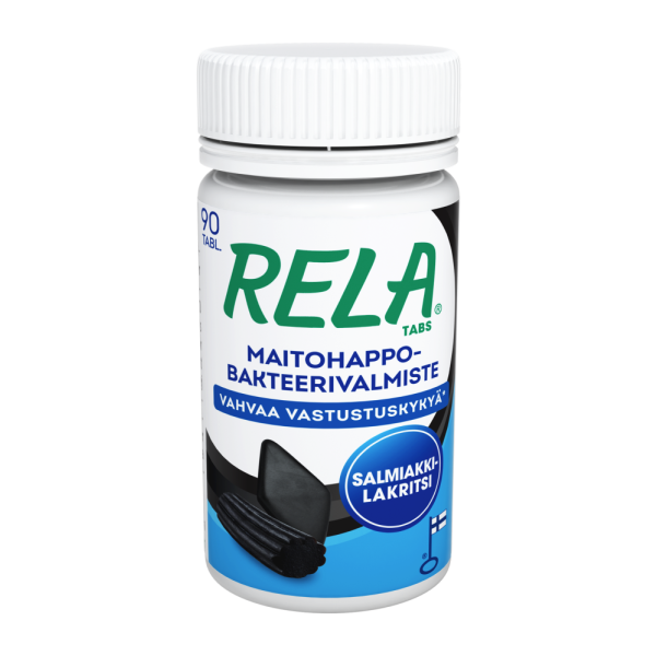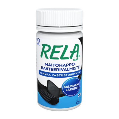 Rela on apteekin suosituin maitohappobakteeri.* Rela-maitohappobakteerivalmisteet sisältävät kahta tutkittua ja korkealaatuista bakteerikantaa (Lactobacillus rhamnosus SP1 ja Bifidobacterium lactis BLC1) ja 3 miljardia bakteeria päiväannosta kohden. Vahvaa vastustuskykyä** – Rela Tabs -tuotteet sisältävät maitohappobakteerien lisäksi C-vitamiinia, joka on tärkeä vastustuskyvyn ylläpitäjä. Rela Salmiakki-Lakritsi maistuu salmiakille ja lakritsille ja soveltuu koko perheelle. Rela-tuotteet on valmistettu Suomessa ja niillä on avainlippumerkki.