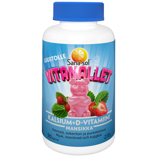 Sana-sol Vitanallet Kalsium+D-vitamiini sisältää kalsiumia ja D-vitamiinia mansikanmakuisena pehmeässä ja pureskeltavassa muodossa 3-vuotiaasta alkaen koko perheelle! Kalsium on tarpeellinen luuston ja hampaiden pysymiselle normaaleina. D-vitamiini edistää veren normaalia kalsiumtasoa, kalsiumin ja fosforin normaalia imeytymistä ja hyödyntämistä sekä luiden ja hampaiden pysymistä normaaleina.