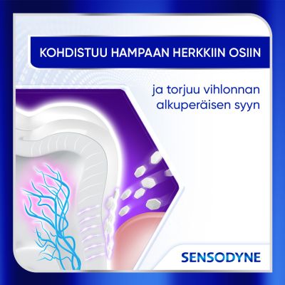 Päivittäiseen käyttöön tarkoitettu fluorihammastahna vihloville hampaille. Alkaa korjata vihlovia hampaita 2 minuutissa*. Kliinisesti todistettu lievittävän vihlontaa pitkäkestoisesti ja auttavan estämään kivun uusiutumista jatkuvassa käytössä. Hammastahna antaa 32 % tehokkaamman puhdistuksen**, mutta on silti hellävarainen vihloville hampaille. Korjaa ja suojaa aktiivisesti vihlovia hampaita Novamin-teknologian avulla*. Ainutlaatuinen Novamin-teknologia sisältää 96 % samoja ainesosia kuin hammaskiille ja muodostaa vahvan ja suojaavan kerroksen hampaiden pinnalle*. Runsaasti vaahtoutuva. Raikas sekoitus piparminttua ja eukalyptysta.Kierrätettävä tuubi ja korkki. *kliinisesti todistettu lievitys vihlontaan 14 päivässä ** vs Sensodyne Repair & Protect Deep Repair
