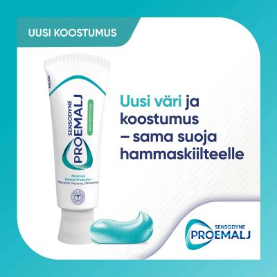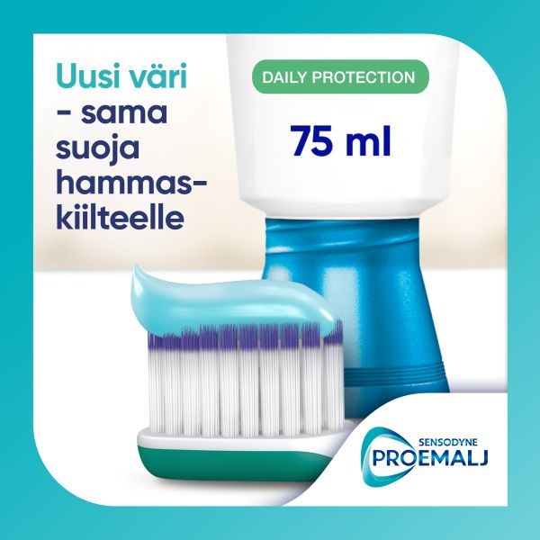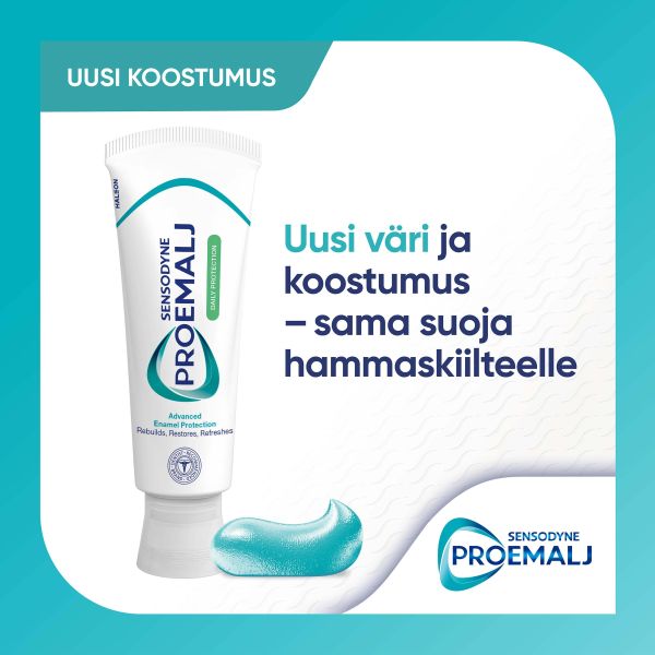 Sensodyne ProEmalj Daily Protection -hammastahna päivittäiseen käyttöön suojaamaan hammaskiillettä happovaikutuksilta kahdesti päivässä käytettynä.