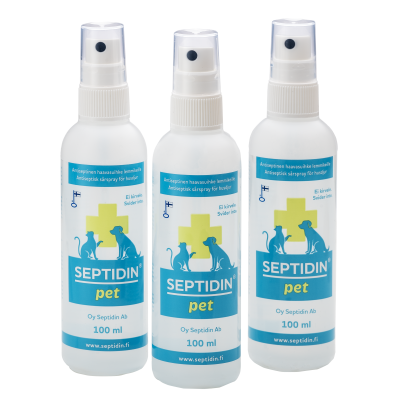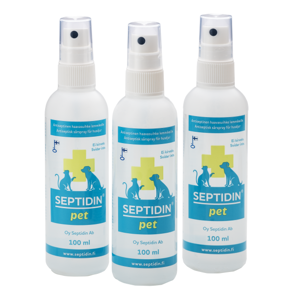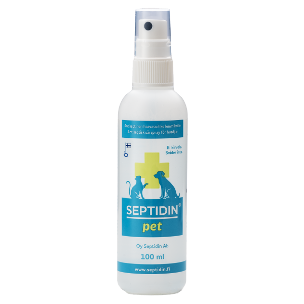 Kirvelemätön, hajusteeton, säilöntäaineeton ja alkoholiton Septidin pet -antiseptinen haavasuihke on tarkoitettu lemmikkien pienten haavojen ja ihovammojen puhdistukseen. Sisältää myös allantoiinia, joka rauhoittaa ärtynyttä ihoa. Vain ulkoiseen käyttöön. Ei silmiin.