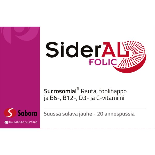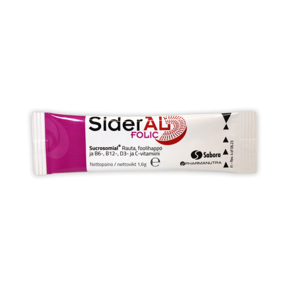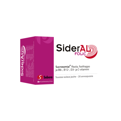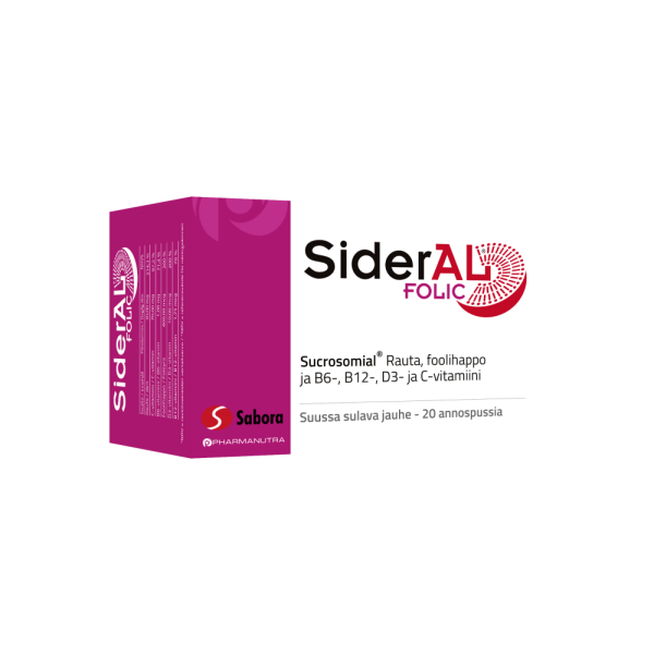 SiderAL® Folic 30 mg on rautalisä, joka sisältää sukrosomiaalista rautaa (Sucrosomial® Iron), foolihappoa ja B6-, B12-, D3- ja C-vitamiinia. Foolihapon ja vitamiinien ansiosta se on erityisesti naisille suunniteltu rautavalmiste. Suun kautta nautittava, hyvänmakuinen ja tehokas SiderAL® Folic sopii myös niille, jotka eivät siedä tavanomaisia rautavalmisteita. Sukrosomiaalisessa raudassa itse rautamolekyyli on suojattu kahdella eri kerroksella. Fosfolipidikaksoiskalvo sekä sukresterikerros (rasvahappojen sakkaroosiesterit) takaavat raudan korkean imeytyvyyden koko ohutsuolen matkalta sekä erinomaisen maha-suolikanavan sietokyvyn.