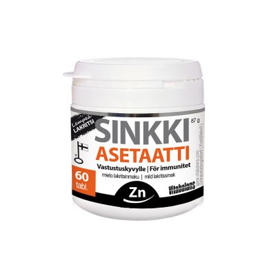 Sinkki Asetaatti on hyvänmakuinen sinkkiasetaatti-imeskelytabletti vastustuskyvylle. Tabletin sinkki on 100 %:sti sinkkiasetaattia, joka on paras sinkin muoto imeskelytabletissa. Tehoannostus kannattaa aloittaa heti, kun vastustuskyky tarvitsee erityistä tukea. Makuvaihtoehtoina lakritsi ja minttu-mansikka.