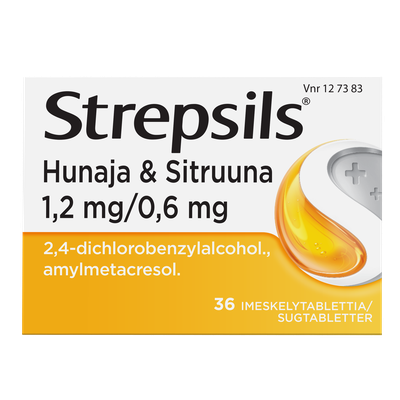 Strepsils Hunaja & Sitruuna on antiseptinen imeskelytabletti, joka lievittää suu- ja nielutulehdusten oireita.
