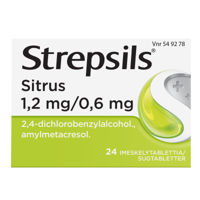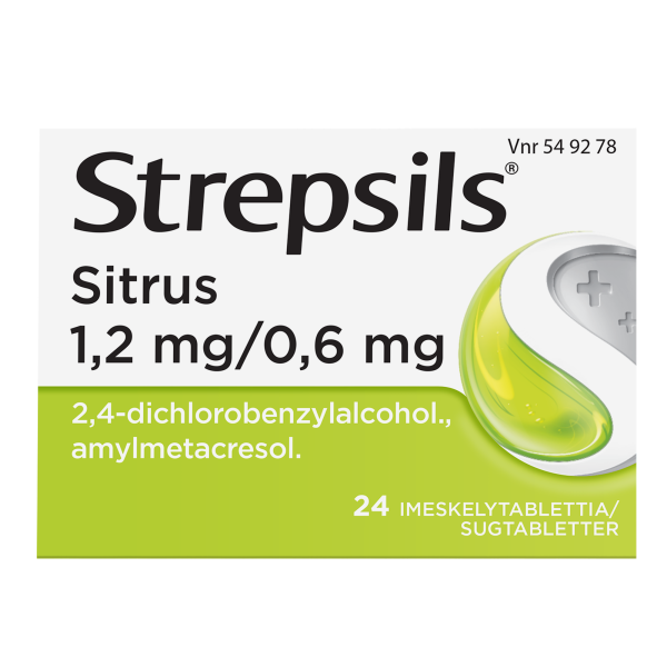 Strepsils Sitrus on sokeriton antiseptinen imeskelytabletti, joka lievittää kurkkukipua ja nielun arkuutta. Alle 6-vuotiaille lapsille ja pitkäaikaiseen käyttöön vain lääkärin määräyksestä.