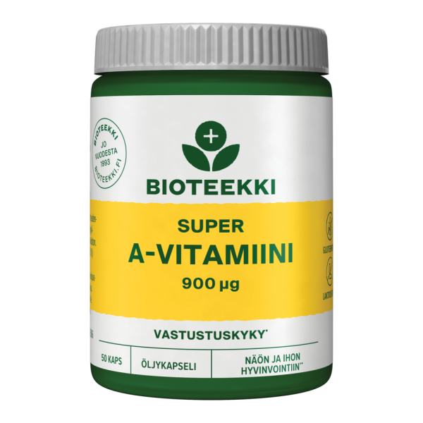 Bioteekin Super A-vitamiini on vahva A-vitamiinivalmiste silmien, limakalvojen ja ihon hyvinvointiin sekä vastustuskyvyn tueksi. Valmiste sisältää 900 µg A-vitamiinia hyvin imeytyvässä öljykapselissa. A-vitamiini edistää näön, ihon ja limakalvojen kuntoa. A-vitamiini myös edistää immuunijärjestelmän normaalia toimintaa. Tuote on laktoositon ja maidoton. Ei sisällä gluteenipitoisen viljan ainesosia. Tuotteella on Valmistettu Suomessa -Avainlippu-tunnus.