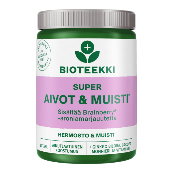 Bioteekki Super Aivot & Muisti on erinomainen ravintolisä aivojen ja muistin suorituskyvyn tueksi. Sisältää patentoitua, kliinisesti tutkittua Brainberry® aroniamarjauutetta sekä aivojen ja muistin toimintaa tukevaa Bakopauutetta. Valmisteen sisältämä neidonhiuspuu-uute (Ginkgo Biloba) tukee kognitiivisia toimintoja, kun taas B6-, B12- ja C-vitamiini tukevat psykologisia toimintoja ja hermoston normaalia toimintaa. Tuote sopii kaikille, jotka haluavat tukea aivojen ja muistin suorituskykyyn. Tuote sopii kaikille, jotka haluavat tukea aivojen ja muistin toimintaa - niin opiskelujen, työelämän kuin ikääntymisen avuksi. Valmiste on gluteeniton ja laktoositon. Soveltuu myös vegaaneille.