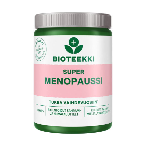 Bioteekki Super Menopaussi on laadukas ravintolisä antamaan tukea vaihdevuosiin ja helpottamaan vaihdevuosiin liittyviä tuntemuksia. Se sisältää kahta standardoitua, kliinisesti tutkittua tavaramerkki -raaka-ainetta: Saffr’Activ®-sahramiuutetta, joka antaa tukea vaihdevuosien mielialavaihteluihin sekä Luprenol® - humalauutetta, joka yhdessä valmisteen puna-apilan kanssa auttaa tasaamaan vaihdevuosiin liittyviä fyysisiä tuntemuksia, kuten kuumia aaltoja. B6-vitamiini osaltaan edistää hormonitoiminnan säätelyä ja edistää normaaleja psykologisia toimintoja. Valmiste on gluteeniton, laktoositon ja maidoton. Soveltuu myös vegaaneille.