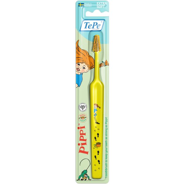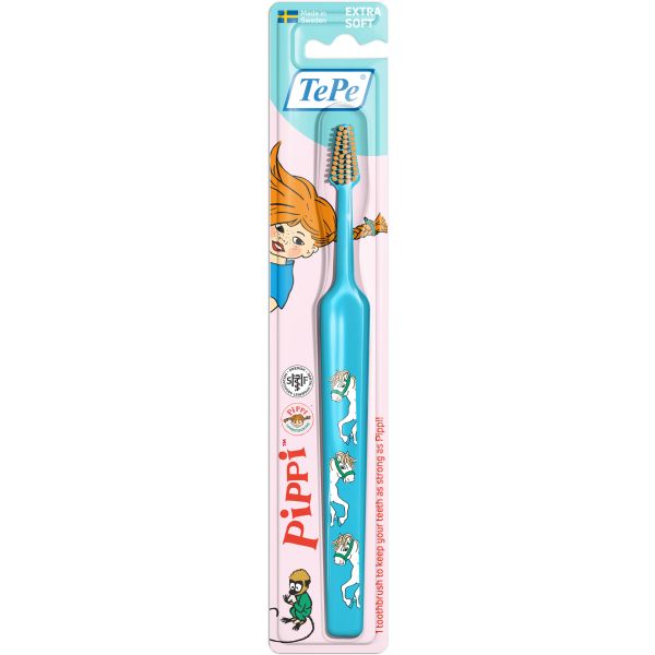 TePe Kids™ Pippi Extra Soft -hammasharja on leikkisä hammasharja, jota suositellaan lapsille 3-vuodesta ylöspäin. Hammasharjassa on pienempi, käyttäjäystävällinen varsi ja kartiomainen harjanpää, jossa on erittäin pehmeät harjakset hampaiden ja ikenien hellävaraista puhdistusta varten. Valittavana on kuusi eloisaa väriä ja leikkisät kuviot, joissa on Peppi Pitkätossu ja hänen ystävänsä - täydellinen keino motivoida lapsia parempaan suuhygieniaan. Vartta voi taivuttaa kuumassa vedessä lämmittämisen jälkeen, jolloin harjasta tulee joustavampi. Harjaa hampaat kaksi kertaa päivässä, aamuin illoin, fluorihammastahnalla, kuten TePe Daily™ Kids -hammastahnalla, ylläpitääksesi hyvää suun terveyttä. Aikuisen tulee valvoa hampaiden harjausta, kunnes lapsi on 10-12-vuotias.