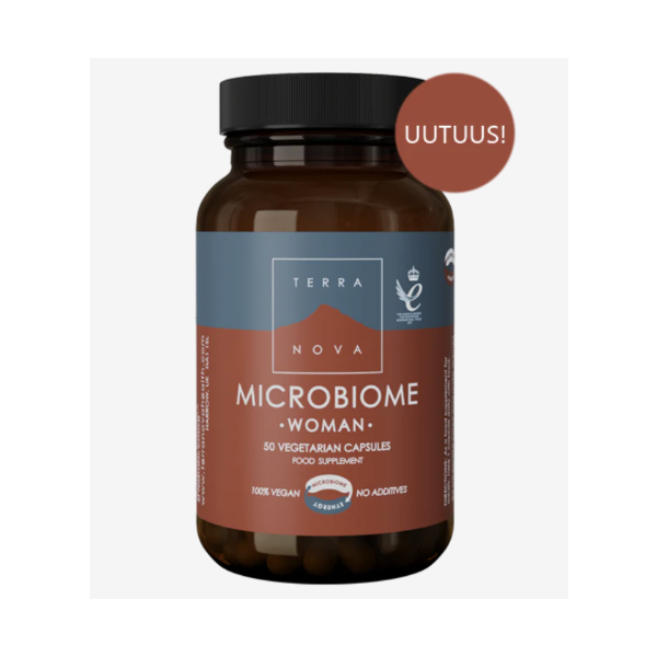 Terranova Microbiome Woman -ravintolisä sisältää huolella valikoidun yhdistelmän neljää eri mikrobikantaa sekä synergistisiä kasviraaka-aineita. Tuote sisältää Lactobacillus crispatus, Lactobacillus jensenii, Lactobacillus gasseri -ja Lactocaseibacillus rhamnosus -maitohappobakteerikantoja. Ainutlaatuinen Magnifood Complex -kasviyhdistelmä sisältää C-vitamiinipitoista karpaloa sekä punajuuren mehua.