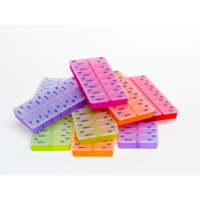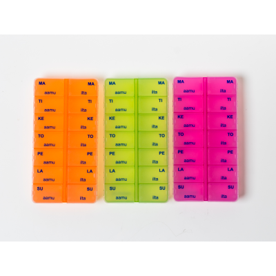 Käytännöllinen ja tilava aamu-iltadosetti, paljon pirteitä värivaihtoehtoja. Lääkkeille, vitamiineille ja ravintolisille. Kansiosa irrotettavissa. Helppokäyttöinen ja suosittu dosetti.