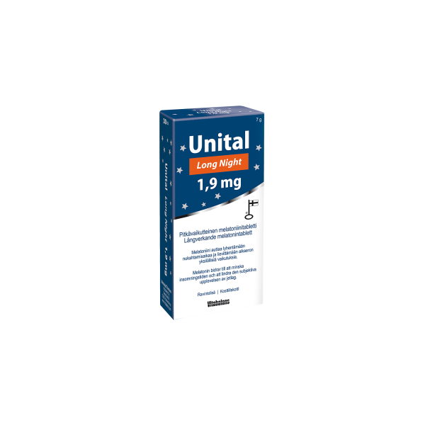 Unital Long Night 1,9 mg -melatoniinitabletit on tarkoitettu lyhentämään nukahtamisaikaa ja lievittämään aikaeron vaikutuksia. Melatoniini on luontaisestikin elimistössä esiintyvä hormoni, joka osallistuu unirytmin säätelyyn ja valmistaa elimistöä nukahtamiseen.