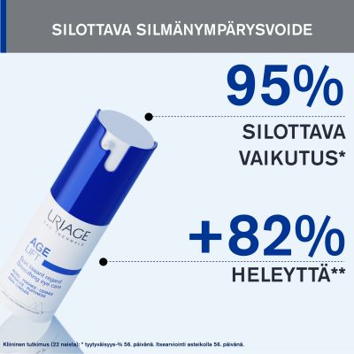 Age Lift Silmänympärysvoide vähentää juonteita ja tummia silmänalusia tehokkaasti, kiinteyttäen ihoa huomattavasti. Tuote sisältää retinolia ja hyaluronihappoa, jotka yhdessä torjuvat ikääntymisen merkkejä ja kosteuttavat ihoa runsaasti. Voide suojaa myös ympäristön saasteilta ja digitaalisten laitteiden siniseltä valolta ainutlaatuisen Sinisen Valon Suojausteknologian ansiosta.