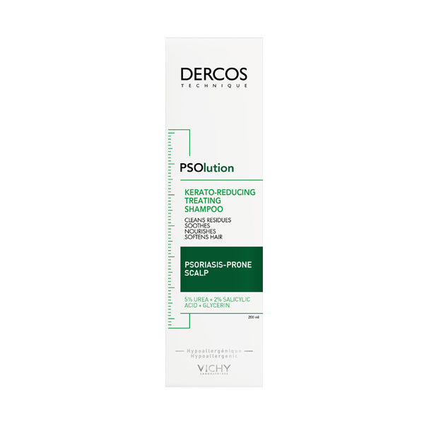 Dercos PSOlution-shampoo, testattu psoriasikseen taipuvaiselle hiuspohjalle. Se sisältää aktiivisia ainesosia [UREA+salisyylihappo+glyseriini], jotka auttavat täydentävänä hoitona psoriasiksen heikentämää hiuspohjaa. Dokumentoitu vaikutus hiuspohjaan: rauhoittaa välittömästi hiuspohjan kihelmöintiä ja auttaa ehkäisemään hiuspohjan epätasapainoa. Vähentää epämiellyttävää tunnetta sekä näkyvää hilseilyä 1 viikon jälkeen.* Jättää hiukset ja hiuspohjan vähemmän rasvaiseksi. Hiuspohja näyttää hyvinvoivalta. Tekee hiuksista pehmeät ja kosteutetun tuntuiset. Hoitaa hiuksia ja antaa niille kiiltoa. Sopii herkälle hiuspohjalle. Hypoallergeeninen. Testattu ihotautilääkärin valvonnassa. *kosmetokliininen tutkimus, 52 vapaaehtoista.