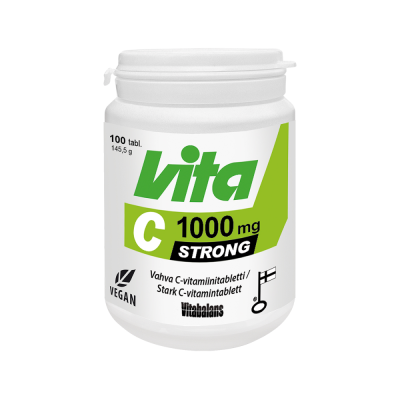 Vita C Strong 1000 mg on erittäin vahva C-vitamiinivalmiste aikuisille. Yksi nieltävä tabletti sisältää 1000 mg C-vitamiinia.