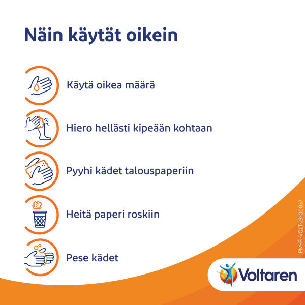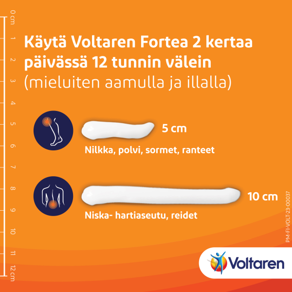 Voltaren Forte -geeliä hierotaan kipeytyneelle alueelle kevyesti 2 kertaa päivässä 12 tunnin välein (mieluiten aamulla ja illalla)