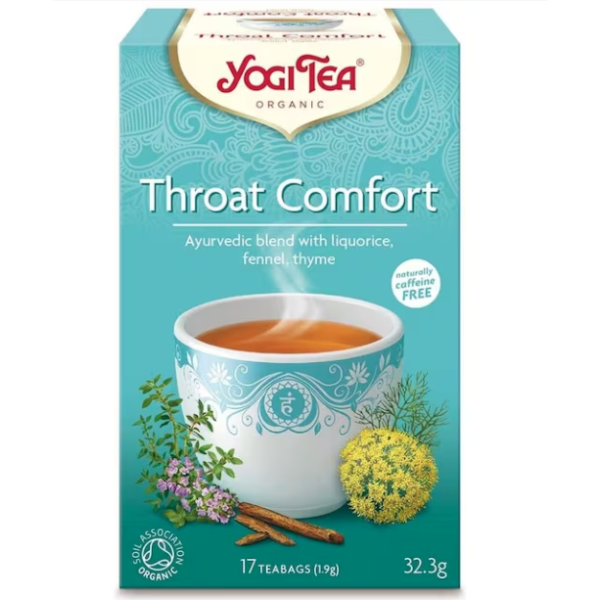 Yogi Tea Throat Comfort tee on kurkkua rauhoittava tee. Sisältää mm. lakritsanjuurta, fenkolia ja timjamia. Luontaisesti kofeiiniton. Nauti huoletta myös iltaisin!